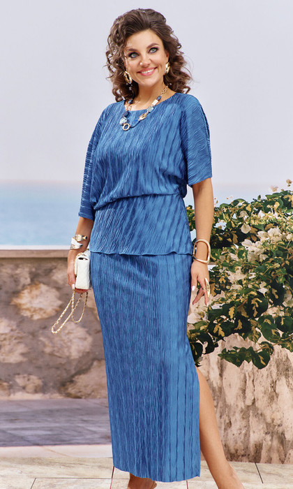 Платье прилегающего силуэта, с округлой формой горловины с ассиметричным подрезом по талии и небольшим напуском. Рукав в платье ассиметричный (левый-цельнокроеный, правый со спущенный проймой через подрез по лифу платья). От подреза притачная баска, юбка платья прямая с разрезом в боковом шве. В боковом шве платья застёжка на тесьму-молнию.Длина платья 135 см. Длина рукава левого 39 см (р.50-54), 40 см (р.56-60). Длина рукава правого 52 см (р.50-54), 53 см (р.56-60)