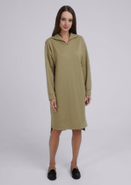 Платье прямого силуэта из фактурной ткани с крэш-эффектом, который создает в силуэте вертикальные  заломы визуально вытягивающие фигуру и придает модели выразительный образ. Короткий рукав-реглан с навесными петельками и пуговицами, обтянутыми основной тканью рисует линию рельефа по переду и спинке сужая плечевой пояс.  Платье на подкладке мягкое и удобное в движении. По спинке в среднем шве короткая потайная молния.