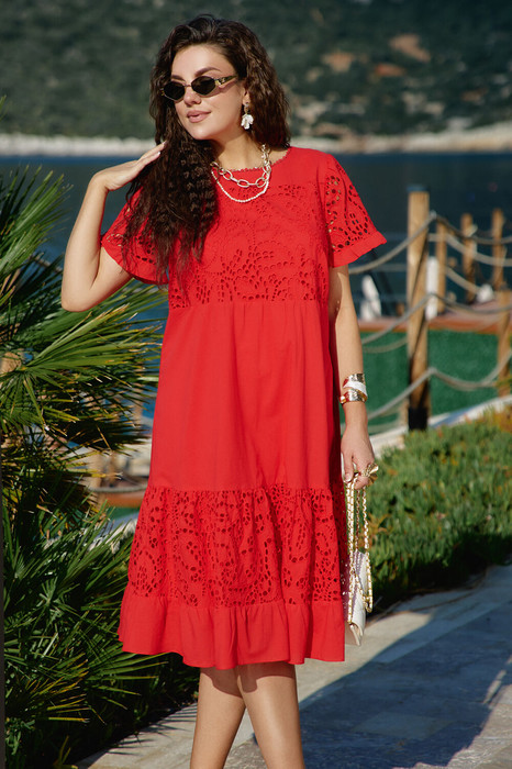 Очень красивое и яркое платье с вышивкой ришелье на хлопке придаст вашему образу игривости и легкости, создает кокетливый и романтичный образ! Эта легкость и свобода создают ощущение, что облачаясь в это платье, ты становишься частью летнего дня. Гармоничное сочетание ткани с вышивкой ришелье и однотона привлекает внимание и восхищает. Огромным достоинством этого платья становятся вставки из ришелье — изысканного ажурного кружева. Платье свободного силуэта, с округлой формой горловины оформленной декоративным кружевом; декоративной вставкой из ришелье по переду платья, подрезом с небольшой сборкой выше уровня талии. По низу платья декоративная вставка из ткани вышивки-ришелье со сборкой от подреза, и притачной однотонный волан со сборкой от подреза.  Рукав в платье втачной из ришелье «на просвет», с притачной однотонной рюшей по низу. Спинка в платье с отрезной кокеткой из отделочной ткани ришелье, фигурным вырезом с декоративными лентами завязывающимися на бант. Длина платья 106 см (р 52-56), 107 см (р 58-62). Длина рукава 20 см (р 52-56), 21 см (р 58-62).