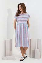 Платье молодежное из полотна «кулирка» в полоску, отрезное по линии талии, с широкой юбкой на сборке, короткими цельнокроеными рукавами, горловиной овальной формы, окантованной основным материалом, с карманами в боковых швах.