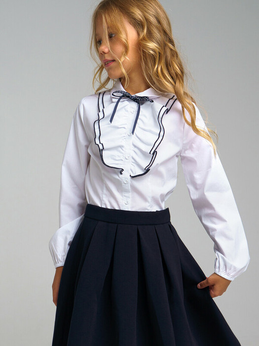 Белая нарядная текстильная блузка полуприлегающего силуэта, приталенная для девочки подростка. Школьная блузка на пуговицах хорошо держит форму, комфортна в носке и проста в уходе. Высокое содержание хлопка. Рубашка в школу с длинным рукавом и декоративной рюшей разнообразит повседневные школьные образы.