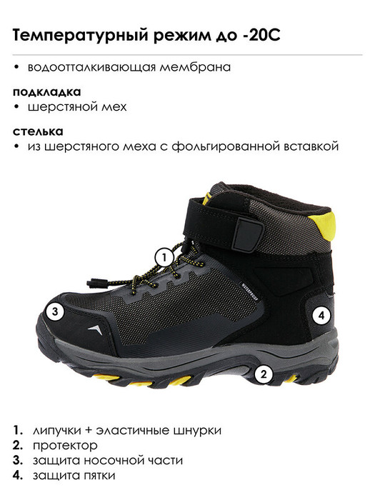 Конструкция верха изготовлена с использованием мембранных технологий. Усиленная защита носка и пятки специальными материалами. Подкладка и стелька выполнены из шерстяного меха 80%. Трехслойная стелька с фольгой, которая обеспечивает сохранение тепла в течение длительного времени. Формоустойчивый задник поддерживает стопу в правильном положении. Подошва имеет противоскользящий протектор. Удобная застежка-липучка и шнурок-утяжка. Рекомендованный температурный режим от 0°С до -20°С.