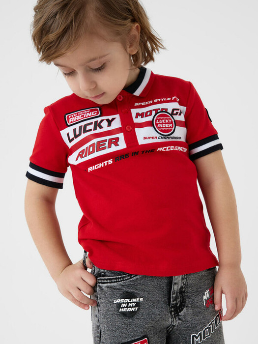 Детская футболка-поло для мальчика. Модель с коротким рукавом, выполненное в стиле мотоспорта. Материал - хлопковый трикотаж пике. Застежка на четыре пуговицы, по бокам небольшие разрезы.