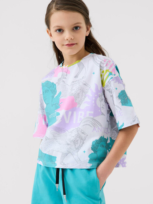 Футболка оверсайз для девочки подростка. Модель выполнена из эластичного хлопкового трикотажа джерси. Красочные принты. Горловина круглая.