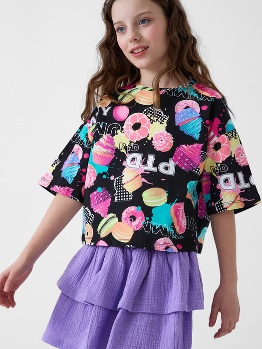 Футболка оверсайз для девочки подростка. Модель выполнена из эластичного хлопкового трикотажа джерси. Красочный принт с пончиками, капкейками и макарунами. Горловина круглая.