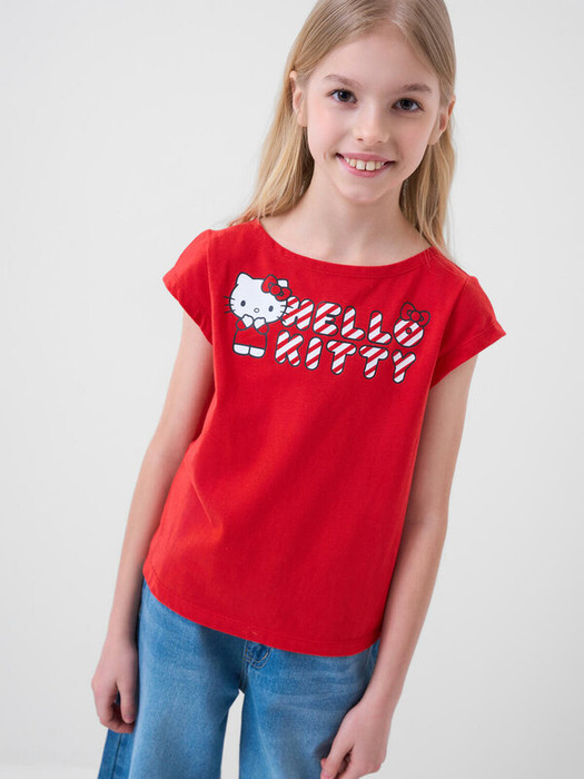 Футболка для девочки подростка. Модель приталенного кроя, выполнена из эластичного хлопкового трикотажа джерси. На груди расположен крупный принт с любимым персонажем Хеллоу Китти.