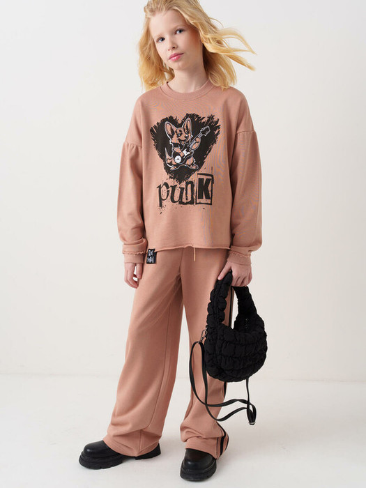 Спортивный костюм для девочки подростка. Комплект выполнен из хлопкового футера и состоит из свитшота и широких брюк на резинке. Толстовка оверсайз с красочным принтом и нашивкой. Рукава-фонарики. Манжеты выполнены из эластичного риба. Широкие брюки — комфортные, с эластичным поясом и шнуром для регулировки посадки. Удобные боковые карманы. Декоративные лампасы.