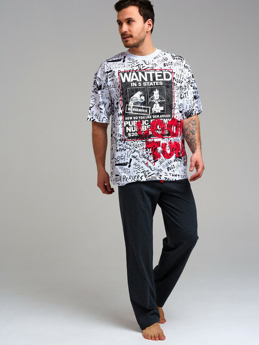 Пижама из качественного и приятного на ощупь трикотажа джерси. 100% хлопок. Футболка силуэта oversize. Брюки comfort fit - свободный крой. Эластичный пояс со шнурком. Карманы в боковых швах.