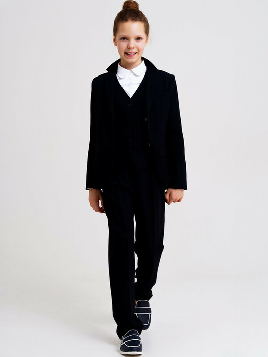 Школьный синий классический костюм - это главный деловой атрибут любой школьницы. Классический костюм для девочки подростка отлично подойдет в школу на каждый день  и для торжественных мероприятий. Именно таким и должен быть современный костюм для школы - элегантный, качественный, красивый и практичный. Костюм для школы выполнен из ткани non-iron, которая не требует глажки после стирки. Пиджак приталенного силуэта на подкладке. Школьные прямые брюки с дополнительной утяжкой обеспечивают комфортную посадку по фигуре. Удобные карманы в боковых швах. Застежка на молнию и пуговицу.