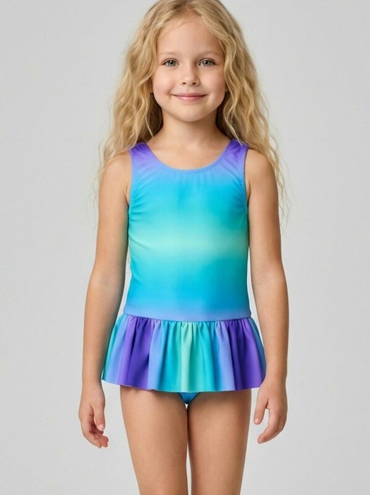 Слитный детский купальник для девочки. Модель выполнена с красивым градиентом от бирюзового к сиреневому. Спереди — классический вырез, сзади — глубокий вырез с декоративной эластичной вставкой. По низу — юбочка, собранная в сборку, придающая образу легкость. Внутри предусмотрена подкладка и гигиеническая вставка. Все края обработаны эластичной тесьмой, чтобы изделие хорошо сидело на теле и не натирало. Благодаря UF-защите, ткань сохраняет первоначальный вид даже при длительном пребывании на солнце. Подходит для плавания и активного отдыха.