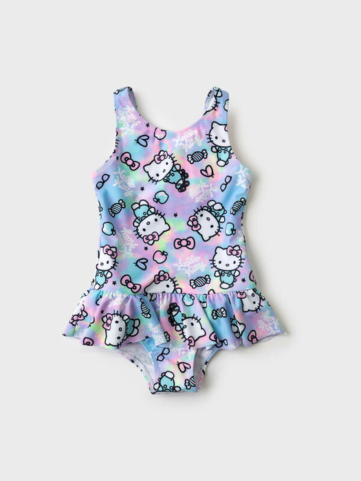 Cлитный детский купальник с ярким дизайном Hello Kitty для девочки. Купальник выполнен в пастельных оттенках с принтом, где изображены Hello Kitty, конфетки, бантики и надписи. По линии талии — декоративная юбочка, которая делает образ ещё более нежным. У купальника открытая спинка с эластичной полоской. Внутри — подкладка. Все края обработаны эластичной тесьмой, чтобы изделие хорошо сидело на теле и не натирало. Благодаря UF-защите, ткань сохраняет первоначальный вид даже при длительном пребывании на солнце. Подходит для плавания и активного отдыха.