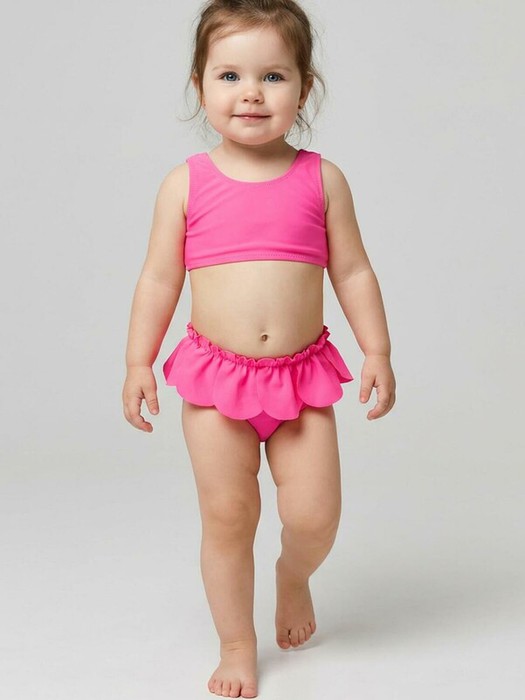 Купальник детский раздельный для девочки. Топ с широкими бретелями. Плавки украшены симпатичными объемными лепестками, которые создают эффект юбочки. Все края обработаны эластичной тесьмой, чтобы изделие хорошо сидело на теле и не натирало. Благодаря UF-защите, ткань сохраняет первоначальный вид даже при длительном пребывании на солнце. Подходит для плавания и активного отдыха.