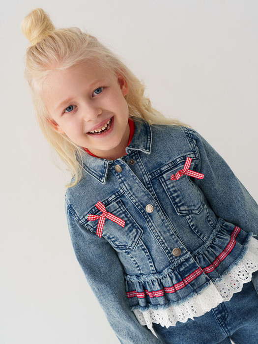 Укороченная джинсовая куртка для девочки. Внизу куртки пришита двойная оборка: из джинсовой ткани и из белого кружева с узорами. Спереди два нагрудных кармана, украшенные маленькими красно-белыми бантиками в клетку. Куртка застегивается на металлические кнопки спереди и на манжетах. Воротник классический, отложной.