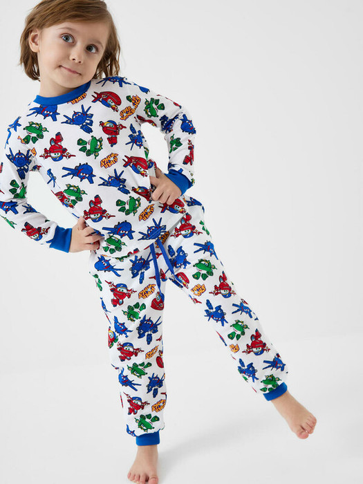 Пижама детская для мальчика. Состоит из лонгслива с длинным рукавом и удобных брюк. Изделие выполнено из мягкого, хлопкового трикотажа с ярким и красочным принтом — изображены персонажи из популярного бренда Super Wings. Лонгслив имеет круглый вырез и мягкие манжеты на рукавах. Брюки также оснащены манжетами внизу и эластичным поясом со шнурком.
