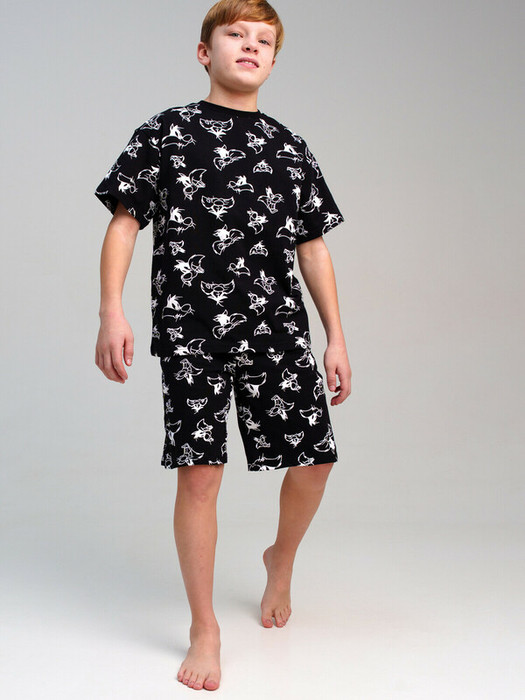 Пижама для мальчика подростка. Футболка и шорты из эластичного и приятного на ощупь трикотажа. Шорты на резинке со шнурком. Шорты с карманами в боковых швах. Высокое содержание хлопка 95%. Благодаря наличию эластана в составе ткани изделие держит форму и меньше мнется.