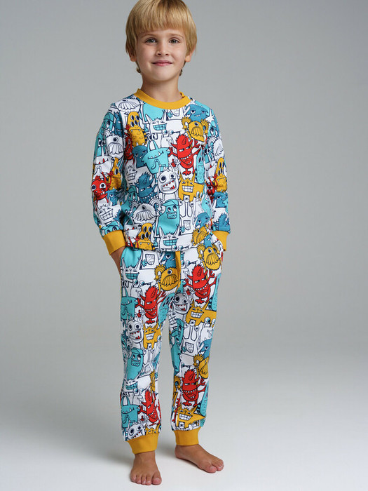 Пижама: свитшот и брюки из трикотажа. 100% хлопок. На брюках эластичный пояс со шнурком. Эластичные манжеты по рукавам и низу брюк.