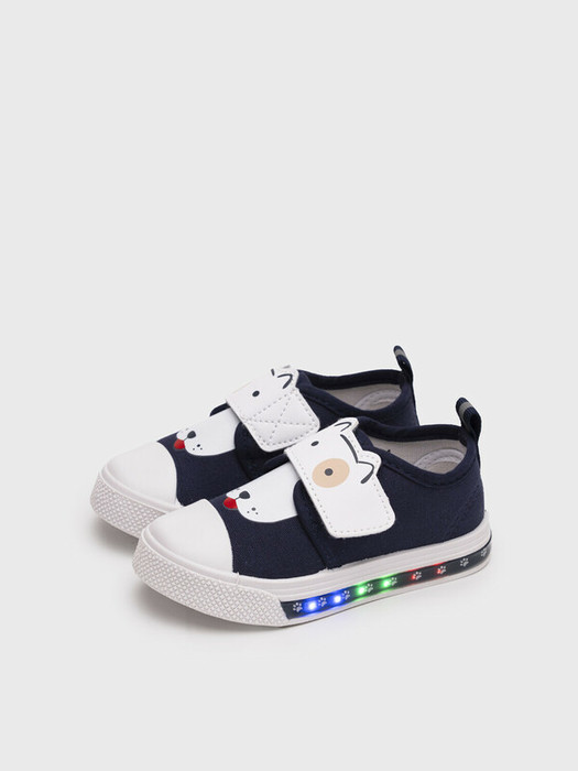 Текстильные детские кеды на подошве с огоньками для мальчика. Для удобства обувания предусмотрена широкая застежка липучка с оригинальной мордочкой собаки. В обуви стоит текстильная хлопковая подкладка c высоким содержанием хлопка 100%, которая обладает высокой гигроскопичностью. Профилированная стелька выполнена из свиной натуральной кожи на основе из амортизирующего материала. Стелька съемная. Имеются светоотражающие элементы. Подошва из ПВХ легкая и гибкая, устойчива к истиранию. Подошва с мигающим элементом flashlight.