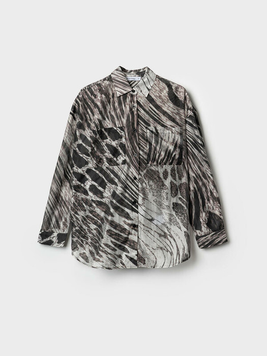 Женская рубашка с анималистичным принтом. Модель свободного кроя с длинным рукавом. Выполнена из лёгкой и полупрозрачной ткани, что придаёт образу воздушность. У рубашки классический воротник, застёжка на пуговицы и два нагрудных накладных кармана. Рукава с манжетами на пуговицах.