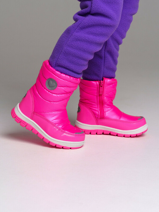 Верх из искусственной кожи и текстильного материала с водоотталкивающим покрытием. Подкладка и стелька выполнены из шерстяного меха 80%. Застежка на молнию. Глухой клапан в области застежки защищает от проникновения влаги внутрь. Формоустойчивый задник поддерживает стопу в правильном положении. Подошва имеет противоскользящий протектор. Съемная стелька позволяет хорошо просушить обувь после прогулки. Рекомендованный температурный режим от 0°С до -15°С.