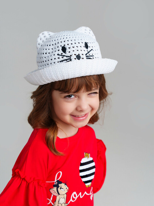 Шляпа детская для девочки. Дизайн мордочка кошки. Внутренняя регулировка размера по обхвату головы за счет атласных ленточек.