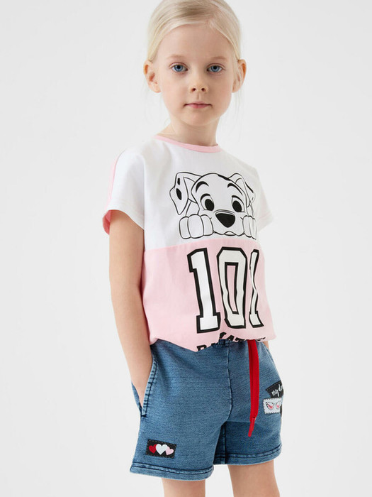 Детские шорты короткие для девочки. Модель свободного кроя. Материал визуально похож на деним, но имеет все качества хлопкового трикотажа. Удобная посадка обеспечивается эластичным поясом со шнуром. Спереди расположены два боковых кармана. Декоративные нашивки.