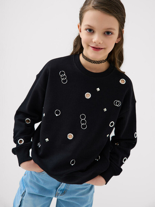 Свитшот оверсайз для девочки подростка. Выполнен из хлопкового футера без начеса. Вся передняя часть и рукава украшены металлическими кольцами и люверсами — они придают изделию необычный и модный вид. Декор размещён в виде множества металлических деталей — как одинарных, так и перекрывающихся колец, похожих на элементы пирсинга. Горловина, манжеты и низ изделия оформлены эластичными резинками.