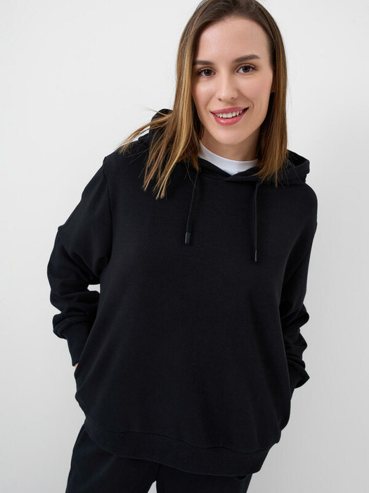 Базовое женское черное худи оверсайз. Выполнена из хлопкового футера без начеса. Капюшон регулируется шнуром. Два боковых кармана. Низ изделия и рукава оформлены эластичными резинками.