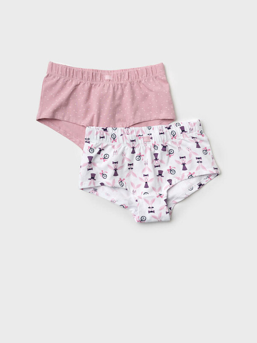 Набор из двух трусов-шорт для девочки подростка. Дизайн в тематике мультфильма "Алиса в стране чудес". Изделия выполнены из мягкого эластичного трикотажа, с широкой резинкой по поясу и окантовкой по вырезам для ног. Внутри предусмотрена ластовица.