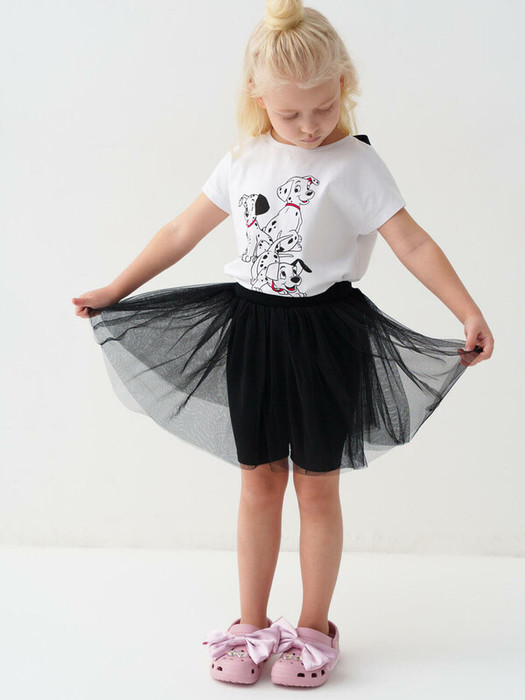 Детская юбка-леггинсы для девочки. Верхняя часть выполнена из легкой сетчатой ткани, под ней — плотные трикотажные укороченные леггинсы. Широкий пояс держится за счёт внутренней резинки. Длина юбки — до середины бедра.