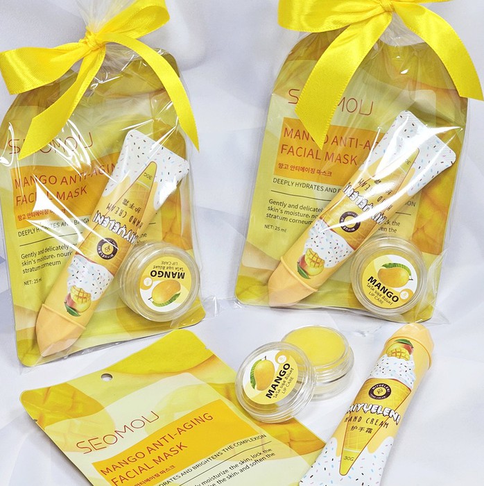 В состав набора входят:, 1. Маска для лица с манго, 2. Крем для рук 30 гр. манго-мороженое, 3. Тайский бальзам для губ ароматический, 4. Упаковка подарочная с лентой