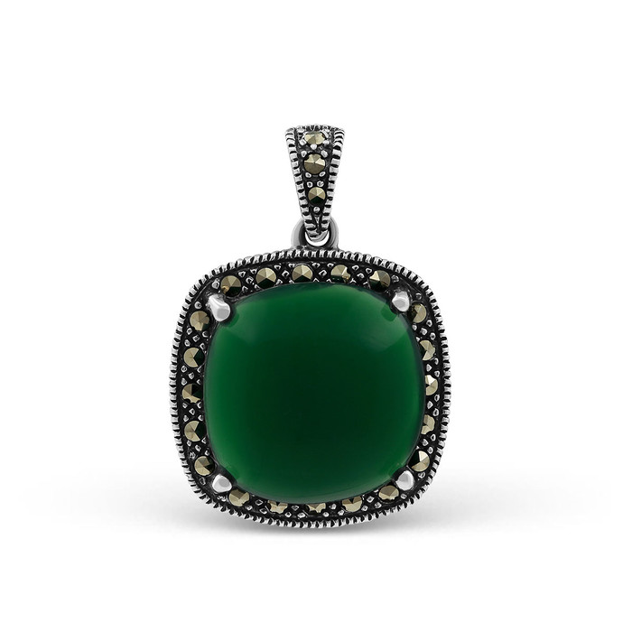 Подвеска из чернёного серебра с нат.зелёным агатом и марказитами 925 пробы MN008