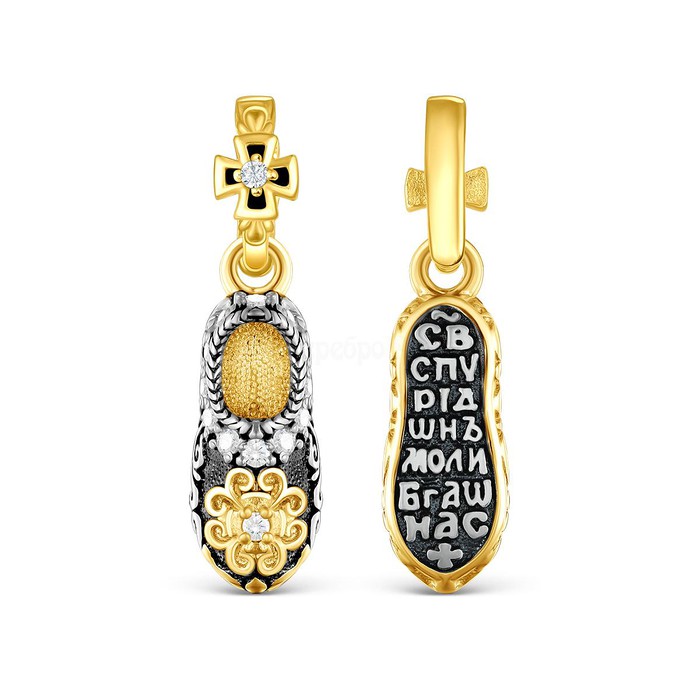 Подвеска религиозная из золочёного серебра с чернением и фианитами - тапочка/баш