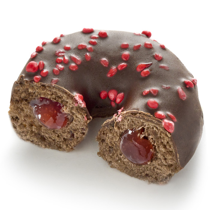 Тесто: пшеничная мука, вода, пальмовое масло, маргарин (растительный жир и масло (пальмовое, рапсовое), вода, концентрированный лимонный сок) , сахар, какао-порошок, дрожжи, соль, эмульгатор (E471-E472e-E481), глютен (пшеничный), разрыхлитель (E450i-E500ii), декстроза, стабилизатор (E412), антиокислитель (Е300), сухая сыворотка (молоко), лактоза (молоко), ферменты, регулятор кислотности (E501i-E500ii).Начинка: вишня, сахар, глюкозный сироп, концентрированный лимонный сок, загуститель (E440), натуральный ароматизатор, экстракт черной смородины. Глазурь: сахар, растительные жиры (пальмоядровые, пальмовые), обезжиренный какао-порошок, эмульгатор (E322). Декор: сахар, инвертный сахар, вода, экстракт красной редьки, загуститель (E414), экстракт лимона, ароматизатор, экстракт черной смородины, экстракт сафлора, глазирователь (E901), глазирователь (E903) Продукт содержит глютен, лактозу и следы орехов и сои.