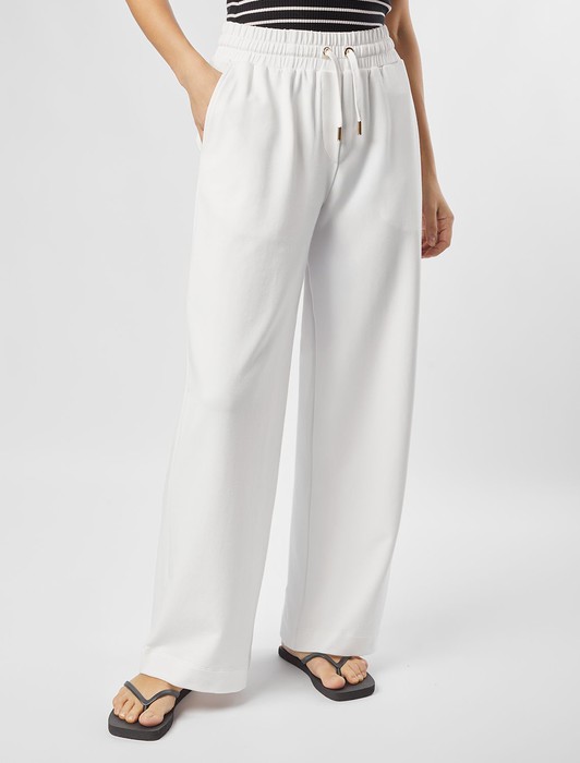 Состав: 95%Хлопок 5%ПУ Плотность: 240 Г/м2 Параметры модели на первом фото: Рост 172, бюст 88, талия 64, бедра 88Брюки выполнены из футера двухнитки с эластаном. Модель прямого кроя дополнена боковыми карманами и одним задним карманом. Пояс выполнен из эластичного трикотажа в рубчик. В пояс вставлен плоский хлопковый шнур в тон изделия с золотистыми наконечниками. Изделие дополнено металлическим логотипом бренда. Сочетается в костюме с жакетом D49.078, джемпером D49.079, D49.080 и футболкой D49.081