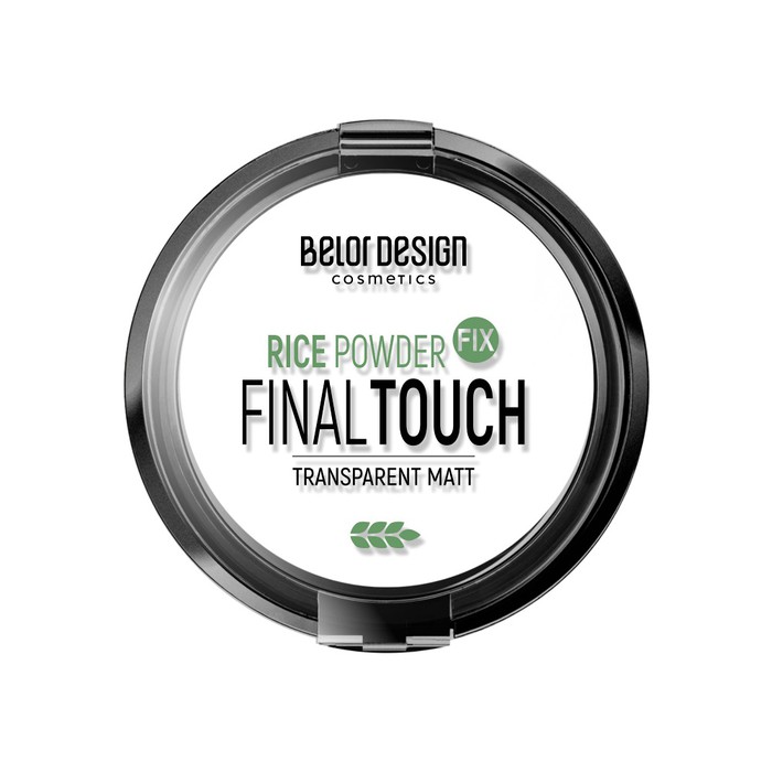 Пудра-фиксатор Final touch - финальный штрих для безупречного образа. Рисовая пудра с естественным матовым финишем освежает кожу и обеспечивает стойкую фиксацию макияжа на целый день. Тонким прозрачным покрытием пудра-фиксатор абсорбирует излишний блеск, оптически разглаживает микрорельеф, адаптируясь ко всем оттенкам кожи. Рисовая пудра походит для кожи любого типа: на сухой коже рисовая пудра поможет ей не терять необходимую влагу, на жирной коже создаст матовый эффект, а на проблемной окажет противовоспалительное воздействие. Несмотря на сильные матирующие свойства и рисовый состав, текстура пудры не ощущается на лице и не сушит кожу. Продукт можно использовать как финишную пудру, в качестве базы под макияж, так и самостоятельно, освежая и создавая защитный барьер на чистой коже. Представлена в универсальном оттенке.