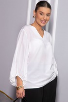 Блузка женская на запах выполнена из мягкой тонкой ткани с люрексом. По полочке изделия расположены нагрудные вытачки. Горловина изделия V-образная с небольшим отложным воротником. Рукав втачной, по окату рукава заложена небольшая сборка, низ рукава присборен на узкую манжету с застежкой петля-пуговица. Низ блузки фигурный асимметричный. Изделия завязывается на бант по боковому шву. Изделие подойдет на рост 170 см