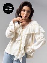 Блузка полуприлегающего силуэта, с втачным рукавом. Застежка центральная на петли и пуговицы. Горловина с воротником рубашечного типа с отрезной стойкой. По линии груди вытачки. Рукав длинный с тремя притачными воланами разной длины.