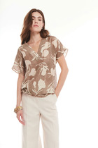 Стильная блузка полуприлегающего силуэта из текстильной ткани серого цвета с легким металлическим блеском. V-образный вырез изделия обработан внутренней обтачкой. Цельнокроеные рукава и низ изделия припосажены на узкую резину.