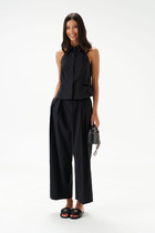 Широкие брюк-палаццо со шлевками-складками. Детали: брюки на притачном поясе, застежка на молнию и брючный крючок, боковые карманы. Задние части брюк с вытачками и имитацией кармана.