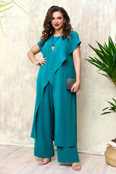 Стильный и практичный комплект, состоит из длинной туники и брюк. Эффектная туника прямого силуэта, выполнена из натуральной струящейся вискозы, с глубокими разрезами по переду на запах, великолепно подчёркивает все формы и линии, скрывая небольшие несовершенства фигуры и делая пропорции максимально гармоничными и естественными. Спинка туники цельная, с таллиевыми вытачками на спинке. Горловина округлая, обработана обтачкой, линия плеча приспущена, рукав короткий, цельнокроеный. Модель изящно ложится по фигуре, визуально удлиняя силуэт. Стильные широкие брюки «палаццо» с классической посадкой на талию. Пояс притачной на эластичной тесьме-резинке. Приятная натуральная ткань, отличная посадка по фигуре позволит выглядеть стильно и модно. В комплект входит стильный кулон-украшение. Модель отлично подойдет для торжественного мероприятия и ежедневной носки.