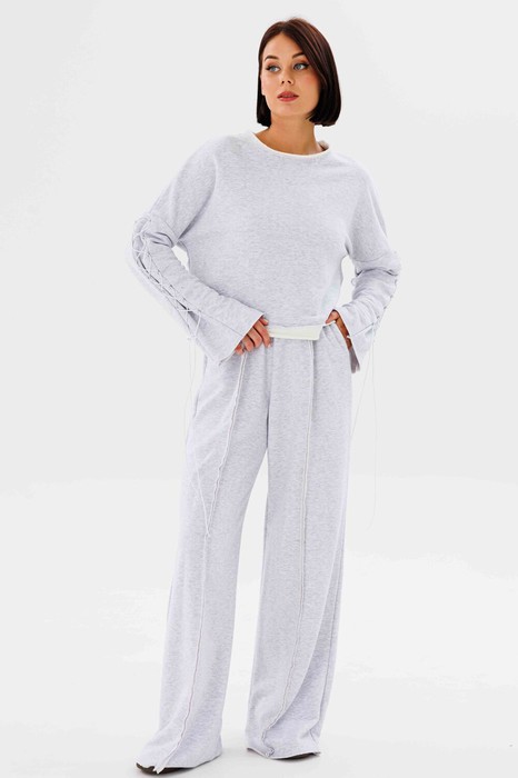 Костюм 2-предметный. Состоит из джемпера и брюк. Джемпер выполнен из трикотажного полотна, , горловина и низ изделия обработана притачной тикотажной деталью с необработанным срезом, с эффеком вытрепанности. линия плечевого шва спущена, рукав имеет клешеную форму, вставу из основной ткани, шнуруется на эластичный шнур. Брюки обработаны резинкой по поясу, вбоковых швах обработаны карманы. по центру передних половинок брючины обабтаны стачными необработанными швами.