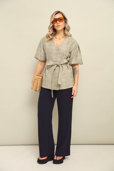 Комплект 2ка, состоящий из жакета и брюк. Легкий жакет на подкладке с объёмными рукавами. Перед на запах без застежки, под пояс по талии. Брюки прямого силуэта на эластичной резинке по талии. По переду расположены карманы с наклонным входом. Длина  жакета по спинке 72-78 см. Длина брюк 110-116 см.