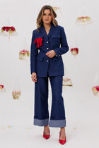 Яркий костюм украсит ваши образы для праздничных мероприятий! В комплект входит белый ремень, который подчеркнёт талию. Сзади у блузки пуговица, по бокам разрезы. Карманы у брюк расположены сбоку.