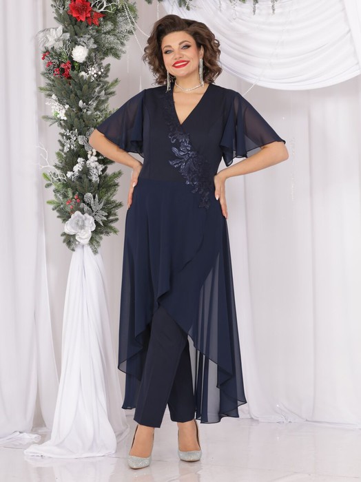 Нарядный комплект, соответствующий модным тенденциям, состоит из брюк-дудочек и оригинального платья, выполненный из эластичной однотонной ткани и шифона. Платье отрезное по линии талии, с роскошной притачной юбкой на запАх, с ассиметричной линией низа и расширенным рукавом. Лиф платья выполнен из основной ткани, по переду лиф с рельефами, V-образным вырезом и запАхом, декорированным аппликацией из кружева и бусинами. Спинка с талиевыми вытачками, со средним швом и потайной застежкой-молнией в нем. Брюки с притачным поясом, по бокам которого вставлена эластичная тесьма (резинка). Застежка брюк классическая, по центру переда на брючную молнию и петлю, пуговицу на поясе. Роскошный наряд для уверенных в себе женщин!