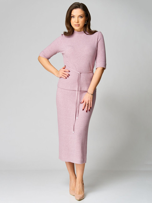 Комплект женский 2-х предметный состоит из туники и юбки из трикотажного полотна в рубчик. Туника прямого силуэта, воротник-стойка, рукав втачной, одношовный с отложной манжетой по низу. Юбка прямого силуэта с разрезом сзади, на трикотажной подкладке. По верхнему срезу притачной пояс с резинкой. В комплекте имеется пояс съемный пояс.
