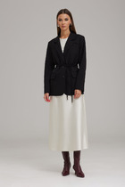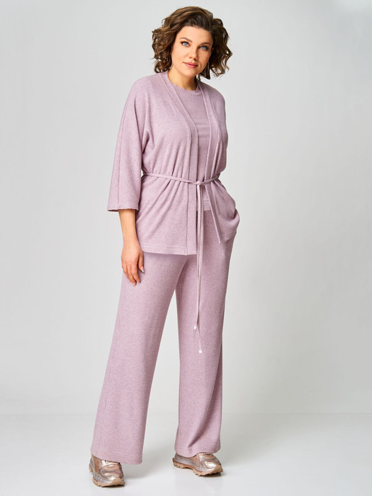 Комплект женский 3-х предметный состоит: кардигана, туники и брюк из трикотажного полотна в рубчик. Кардиган прямого силуэта, цельнокроеные рукава, горловина и подборта обработаны планкой. Туника прямого силуэта, воротник-стойка, рукав втачной, одношовный с отложной манжетой по низу. Брюки средней посадки, облегающие по бедрам и прямые от колена. По верху брюки пояс на резинке, которая обеспечивает максимально комфортную посадку на любой тип фигуры. По переду боковые карманы. В комплекте имеется пояс съемный пояс с наконечниками