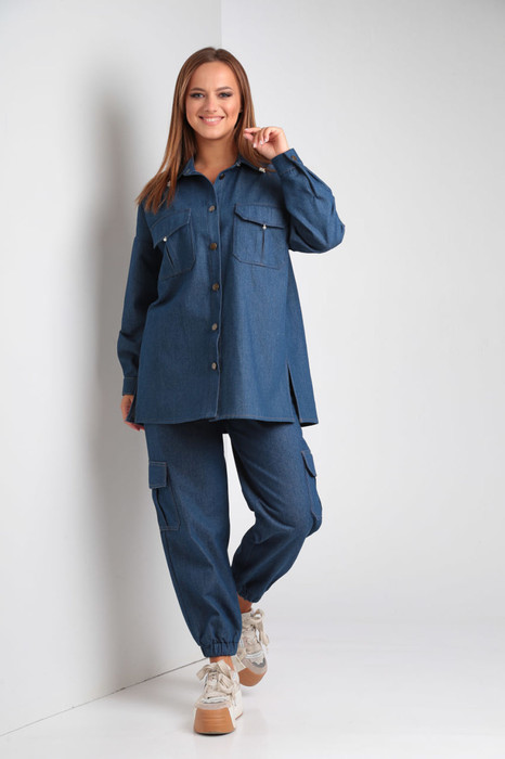 Современный джинсовый костюм оверсайз. Удобный, стилый. Рубашка на пуговице с манжетом. Воротник на стойке с декором из бусин-жемчужин на углах. Штаны -джоггеры с высокой посадкой и карманами по бокам. Премиальное качество.