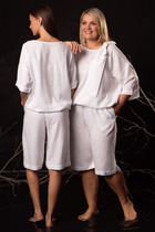 Костюм женский 2-х предметный полуприлегающего силуэта, состоит из жакета и брюк из костюмной ткани. Жакет на подкладке. Жакет с центральной бортовой застёжкой на 2 петли-пуговицы до линии перегиба лацкана. Детали переда с отрезными бочками, горизонтально расположенными боковыми прорезными карманами с клапанами и нагрудными вытачками от разрезов карманов. Спинка со средним швом. Рукав втачной, двухшовный, длинный. Воротник пиджачного типа, углы воротника длиннее, чем лацканов. Брюки прямые, слегка зауженные к низу, с застёжкой на тесьму - молнию в средних срезах передних половинок на гульяик и откосок. Брюки с притачным поясом, застёгивающимся на 1 петлю-пуговицу и с резинкой по задним половинкам брюк. По передним и задним половинкам заутюженные стрелки. Длина жакета по спинке - 66 см. Длина рукава - 60 см. Длина брюк по боковому шву - 99 см.
