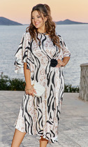 Платье летнее из хлопкового шитья. Полуприлегающего силуэта, с втачным рукавом, отрезное по талии. Полочка отрезная по талии, с нагрудной вытачкой. Нижняя часть платья присобрана по линии талии. По низу отрезной волан. Спинка с фигурным вырезом, застежкой по горловине спинки на пуговицы, и от боковых швов с пояском на завязках. По талии отрезное, нижняя часть вверху на резинке, по низу отрезной волан со сборкой. Рукав внизу на узкой манжете, присобран по окату и по шву притачивания манжеты.