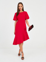 Платье женское прямого силуэта из плательной ткани. По переду нагрудные вытачки. Внизу-печать. По спинке фигурный вырез, складки и печать по центральной детали. В боковых швах карманы и разрезы внизу. Горловина круглой формы. Рукав спущенный с притачной манжетой.